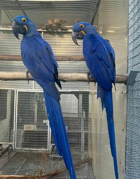 Hyacinth macaws have impressive cobalt blue feathers, which contrast with their bare yellow eye ring (which, in other species of macaw is white) and the yellow patch of skin beside the lower bill. Their irises are dark-brown in colour and their feet are dark grey. Females and males are nearly indistinguishable, but the females are typically a little more slender. On juveniles, the upper bill is paler and the tail is shorter.